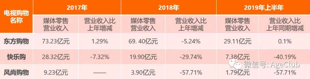 Ageclub对国内电视购物上市公司近三年的年报数据进行对比分析,体量不大的头部电视购物企业包括电视购物在内的媒体零售营业收入逐年递减,风尚购的媒体零售收入甚至减少50%以上。