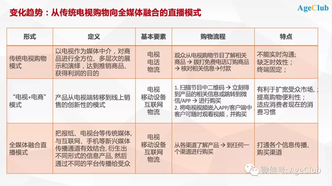 5、多触点、全场景触达中老年用户是电视购物发展新动能,电视购物行业整体正在从传统电视台购物模式向全媒体融合的直播购物模式转型;