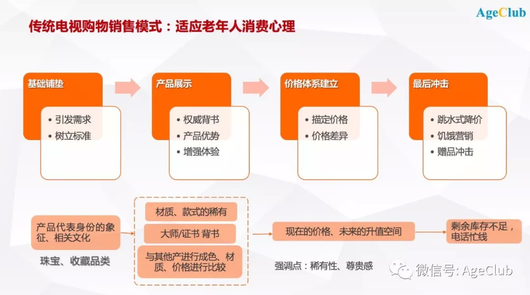 1、电视购物因为其销售模式:前期铺垫-产品展示-价格体系-最后冲击,使中老年消费者很容易被其营销视觉所吸引,从而引发强烈的购买欲。