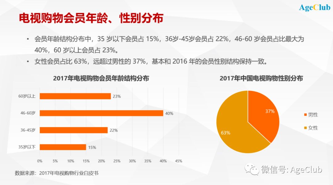 据2017年电视购物行业白皮书统计,46岁以上的中老年电视购物会员占比76%,女性成为电视购物主力军,中老年仍是电视购物的主力军。