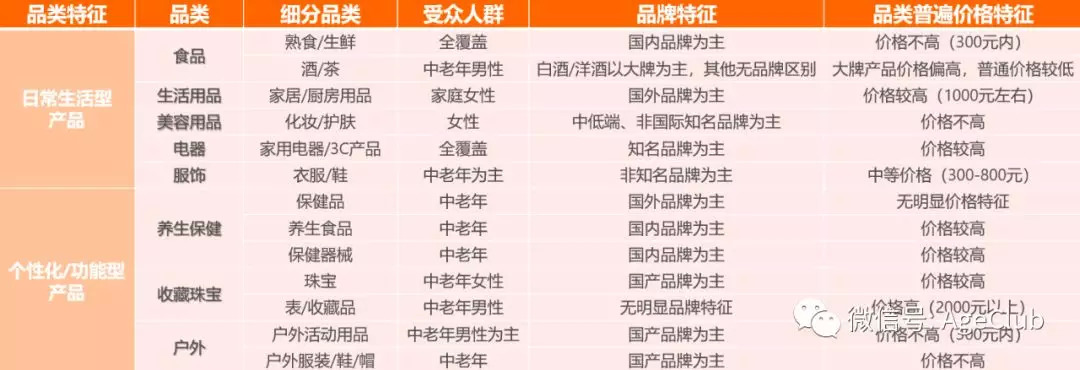 这类产品的受众以中老年人群为主,无明显的品牌特征,除户外产品及普通保健品外,价格普遍偏高。