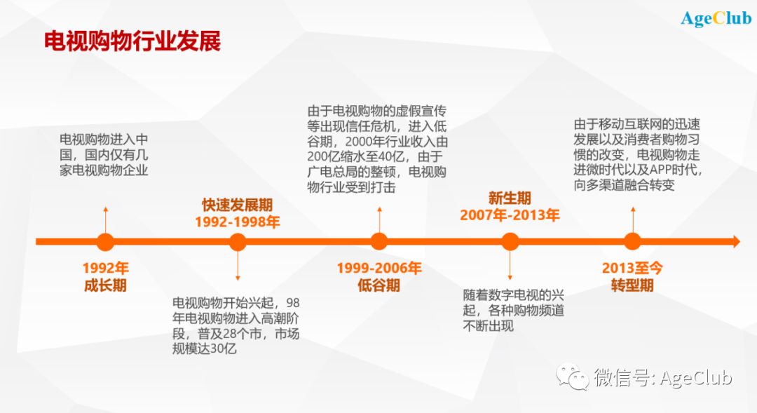 电视购物行业从1992年开始起步,从最初的大规模兴起,到出现信任危机以及行业整顿进入低谷期,再随着数字电视的普及进入新生期,接着移动互联网兴起以及消费者购物升级,目前正在经历长时间的转型尝试期。