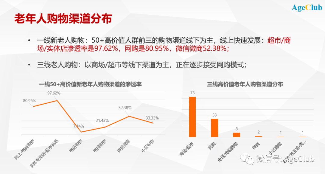 不管是一线城市还是三线城市,对于中老年群体来说,线下仍是他们最主要的购物渠道。