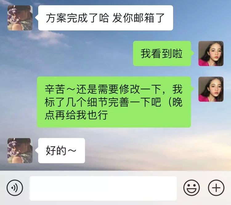 试想,当你对同事提交给你的方案不满意时,一方面难以开口要求对方加班修改,怕搞僵同事关系,另一方面对于TA挤压给你的大量后续工作又感到不公平,不妨利用半括弧给对方发一句:“辛苦啦,方案需要修改,标出的细节部分再完善一下吧(晚一点再给我也没关系。”催稿的重点变成了括弧内对时间的宽限,提出要求的同时展现了自己的体贴。在向领导提出自己的意见时,适时地句子末尾加上一个(灵感突现,或者(这样真的会更好,一个谨慎可爱但是坚持独立思考的优秀员工形象跃然屏上,让人好感倍增。