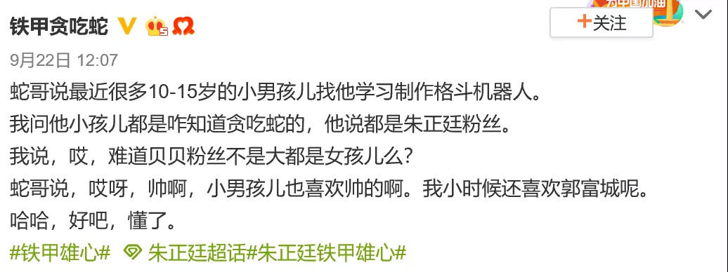 茹晨表示,团队会从专业性、气质契合度以及国际化的角度挑选经理人。“北极星”小姐姐并非只能在戏里玩转金属,演员本人也是机械工程专业,有参加机器人大赛的经历。不过,他也并不否认借助流量“破圈”的意图,“铁甲格斗的核心粉丝还是男性居多,综艺播出的这一两年,开始有相当多的女性粉丝参与到我们公众号、微博、包括社群的讨论中,这个策略是有明显收效的。”