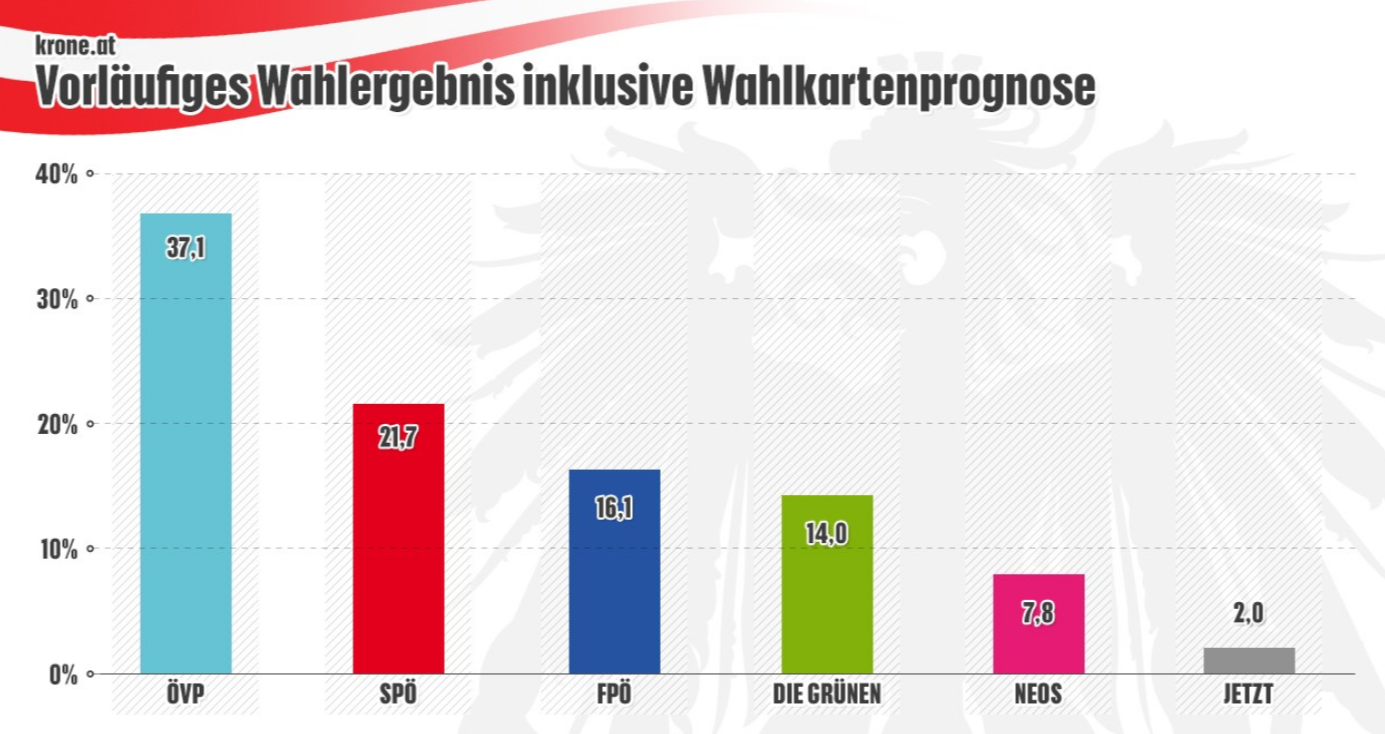 而另一传统大党、中左翼的奥地利社民党(SPÖ)得票率仅为21.7%,创下该党历史最差成绩。于四个月前因涉嫌通俄而被千夫所指的极右翼民粹主义政党奥地利自由党(FPÖ)则依旧顽强地获得了16.1%的选民支持。