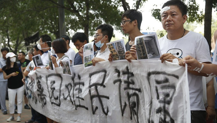 8月16日上午,天津“8.12”爆炸事故第六场新闻发布会在美华酒店召开,10时30分左右,天津启航嘉园的数十名业主聚集在酒店外请愿,希望政府回购在此次爆炸事故中受损的房屋。