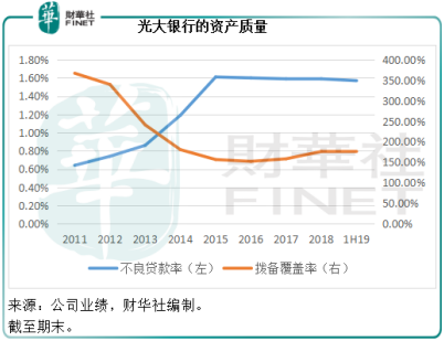 截至2019年6月30日,光大银行的不良贷款率由年初时的1.59%,改善至1.57%,拨备覆盖率由年初的176.16%,增至178.04%,稍高于150%的监管基本标准,远未到达监管要求的2倍。