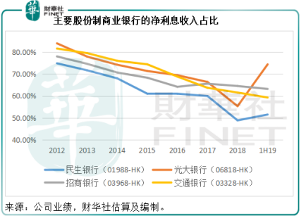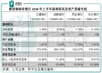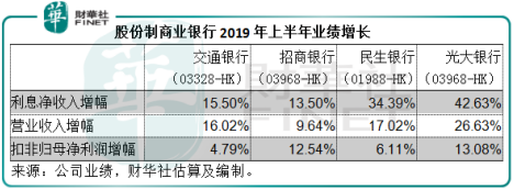 2019年上半年,相较四大国有商业银行,主要的股份制商业银行包括交通银行(03328-HK)、招商银行(03968-HK)和民生银行(01988-HK),收入增速都颇为显眼,交行和民生银行的营业收入增幅甚至高于增长最快的工商银行(01398-HK),分别达到16.02%和17.02%。光大银行的收入增幅更为强劲,达到了26.63%。