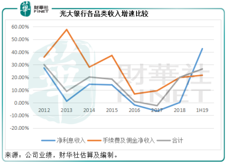 利息净收入大增42.63%,应该是推动光大银行营业收入大增的主因。2019年上半年,该行的利息净收入同比大增42.63%,至491.83亿元,占总收入的74.36%。