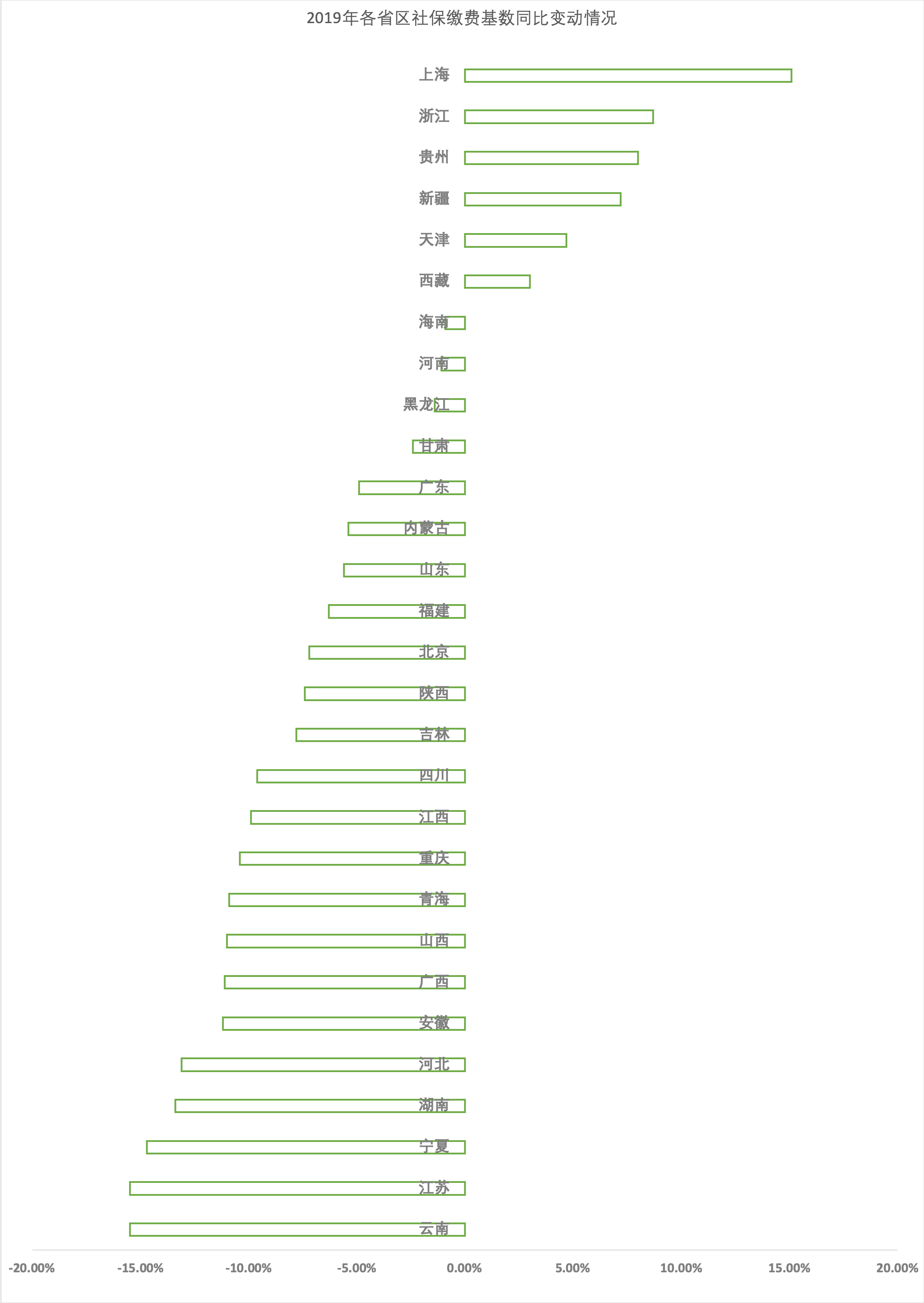 从上图可以看出,江苏和云南两省的社保基数下调幅度最大,均为15.5%;宁夏、湖南、河北、安徽、广西、山西、青海和重庆等8省(区、市)也有10%以上的降幅;广东、黑龙江、河南和海南基数下降幅度较小,降幅不到5%。