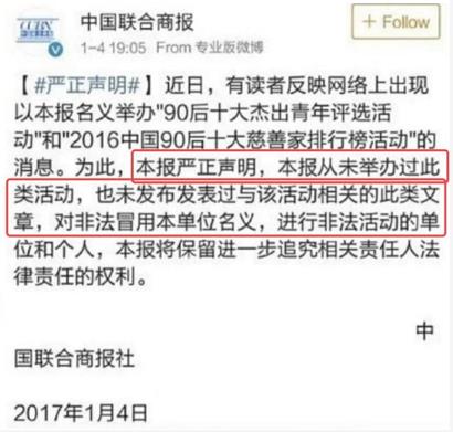 2017年,王源、王俊凯的粉丝因偶像公益问题发生争执。两人从对撕到挂人,事情发展逐渐失控,演变成了轰动饭圈的“满雪莹名誉纠纷案”。 论起这桩公案的源头,乃是中国联合商报发布的“慈善名人榜单”。其中,王俊凯以捐款268万位列榜单第三。偶像的公益“实绩”,粉丝当然纷纷转发推广。可不久后,中国联合商报官方否认此事,榜单疑似钓鱼网站操控闹剧。 这就尴尬了。数据来源不明,粉丝却早已把“王俊凯捐款268万”的消息传遍微博。一时间,质疑王俊凯“假慈善”的声音此起彼伏。其中疑似王源粉丝@不二熊家的雪莹酱更是冲在前头,将事件定义为“诈捐”,并圈出中国青年杂志、深圳特区报等进行举报。