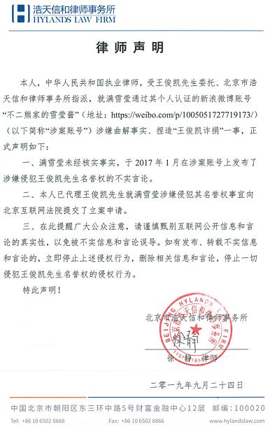 眼见偶像名誉受损,疑似王俊凯大粉@SW苏唯对满雪莹发起反击,隔空对骂中使用了部分侮辱性字眼,双方最终对簿公堂。 此案近日宣判,SW苏唯败诉,需要按照满雪莹的要求公开认错。与此同时,SW苏唯也要求对方就造谣王俊凯诈捐一事道歉,还偶像清白。 不过,双方都未能按照自己预想目标执行,反倒让此事再度扩散。9月24日,王俊凯工作室首次回应此事,直指满雪莹恶意抹黑,对王俊凯造成了伤害,表示已向法院立案申请进行维权。