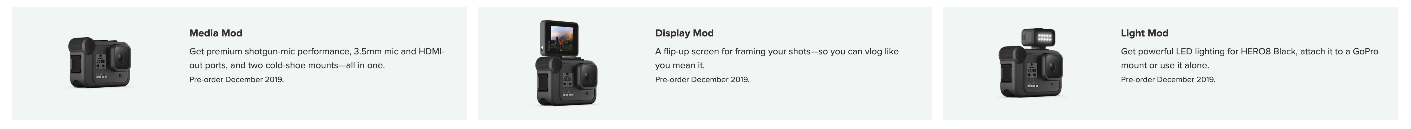 虽然没有提供前置监控屏幕,但GoPro为HERO8 Black带来多款配件,其中包括媒体选配组件(售价79.99美元)、显示选配组件(售价79.99美元)以及灯光选配组件(售价39.99美元)。以上配件将于12月开启预售。