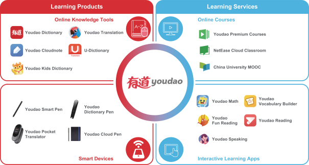有道的产品包括学习工具类应用(有道词典、有道翻译官、有道云笔记等)、在线课程(有道精品课、网易云课堂等)、可在移动端与虚拟老师进行学习的内容互动课(有道数学、有道乐读等)和智能硬件(有道翻译蛋、有道智能笔等)。在线教育课程的销售和基于流量的广告业务成为了有道的主要营收来源,在其总营收中占比分别为57.4%和42.6%。