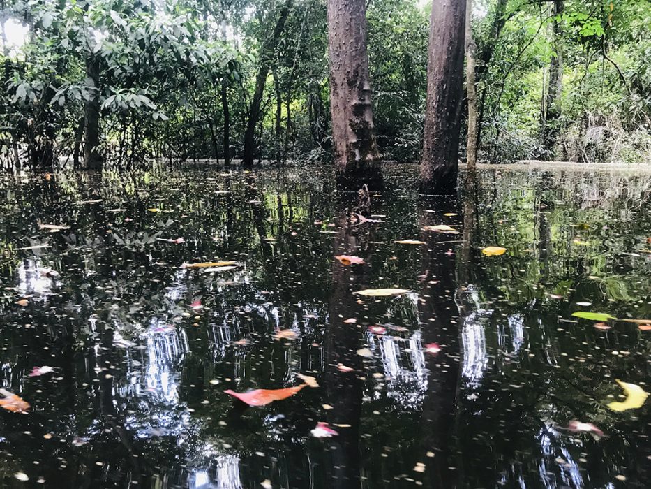 与亚马孙河不透明的棕色水流不同,里约内格罗河在葡萄牙语中意为黑河,因其闪亮如镜面而得名。“水就像从森林叶子里泡出来的茶,”在巴西马瑙斯的亚马孙国家研究所研究植物物候、森林生态学和树木大气影响的乔丹·马丁斯(Giordane Martins)说,“它是黑色的,因为雨水在流向河流的途中渗透了森林地面上的树叶。”从树叶和根中提取的单宁和其他有机化合物使里约内格罗河的水呈酸性,从而杀死了某些微生物。植物也从水中吸取养分。酸度和营养缺乏对人类游客有着意想不到的积极影响——因为这种酸性物质破坏了蚊子的幼虫,蚊子的数量明显减少了。里约内格罗独特的生态系统已经适应了季节水的流量。高大壮丽的树木和棕榈树已经进化出巨大的根,在洪水和枯水季节都能茁壮成长,它同时也孕育了数百种植物、鸟类和陆地动物。