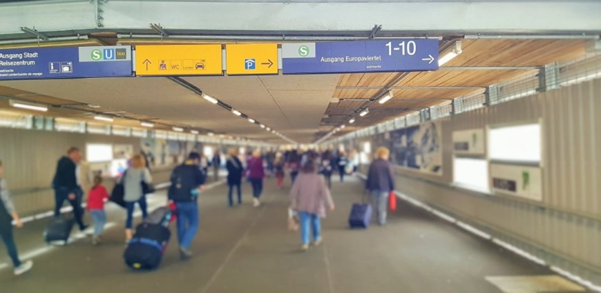 (连接斯图加特火车站月台和候车区的临时通道,该通道下方即为S21工地。钱伯彦摄于斯图加特)