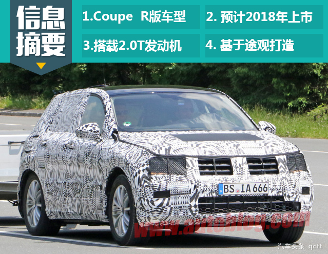 途观Coupe R车型将由大众公司R部门设计研发。该车会搭载高尔夫R上的涡轮增压2.0升汽油发动机,最大功率将有可能超过300马力,最大扭矩或达到380牛 米,与之匹配的是6速双离合器自动变速箱和四驱系统,并配备电子扭矩矢量分配功能。途观Coupe R的直接竞争对手将锁定奔驰GLA45 AMG、奥迪RS Q3以及计划推出的宝马X2 M和揽胜极光SVR。