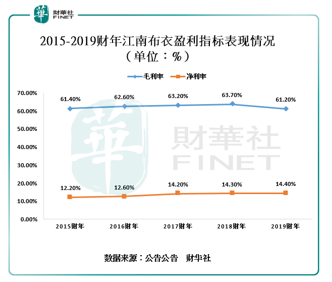 值得注意的是,在公司经营业绩稳步上升的同时,盈利能力保持在较高的水平。截至2019年6月30日(如下图所示),近5个财年,江南布衣的毛利率维持在60%以上。从毛利率增长轨迹上看,2019财年江南布衣的毛利率有下行的压力,这主要是公司低毛利率的新兴品牌及其他品牌(2019财年毛利率为40.8%)收入逐年递增所带来的影响。同期净利率表现要优于毛利率,这主要受净利润增速高于营收增速的影响。