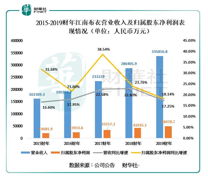 会员规模不断壮大,公司的经营活动中产生的效益也有喜人的表现。截至2019年6月30日,江南布衣的营业收入从2015财年的16.13亿元人民币(单位下同)增至2019财年的33.58亿元,年复合增长率为20.12%。同期归属股东净利润从1.97亿元增至4.85亿元,年复合增长率为25.26%。
