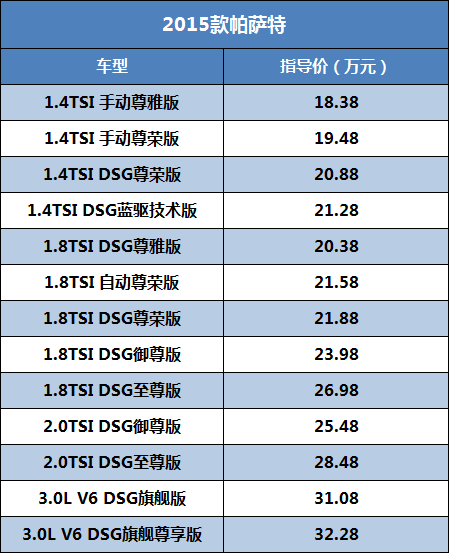日前,上海大众2015款帕萨特正式上市,新车主要在配置方面有一定的提升。2015款帕萨特搭载1.4TSI、1.8TSI、2.0TSI以及3.0L自然吸气发动机共四种动力,提供13款车型,具体车型售价并没有调整,售价区间为18.38-32.28万元。