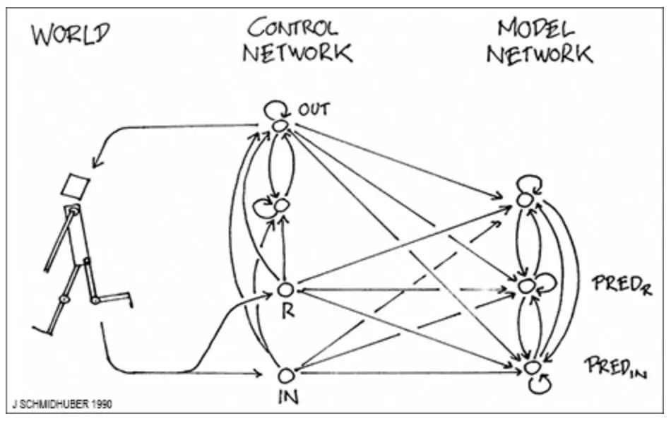 1990 年,我介绍了基于两个 RNN 的组合 (分别称为控制器 C 和世界模型 M) 的强化学习和规划。M 学习预测 C 行为的后果。C 学习使用 M 提前规划几个时间步骤,并选择最大化预测累积奖励的动作序列。基于此也有许多后续研究。