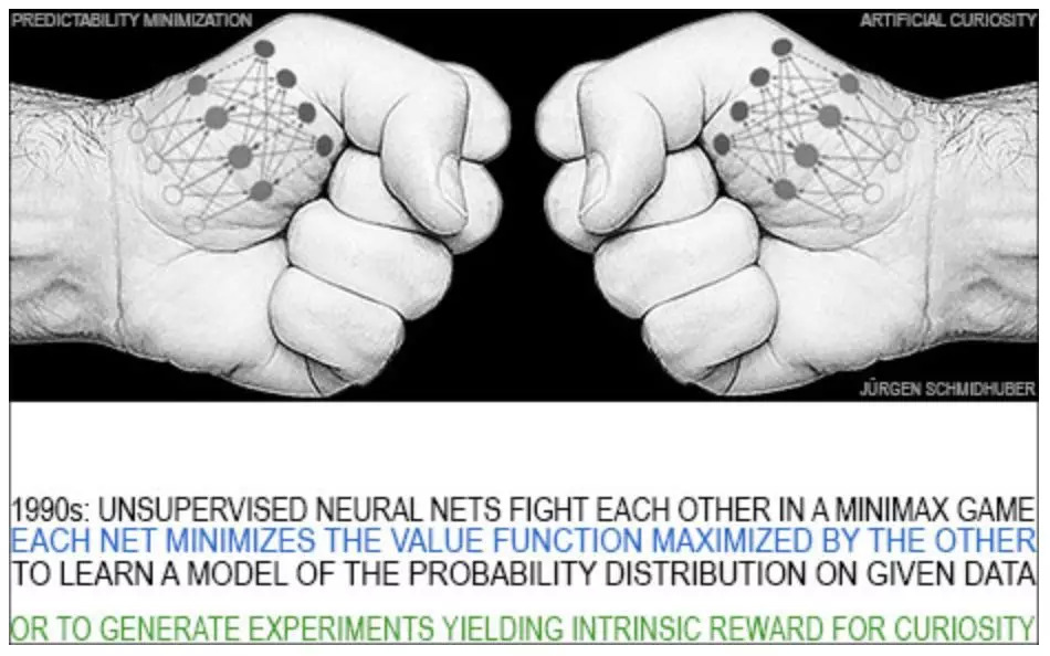 当人类与世界互动时,他们学会预测自己行为的后果。他们也很好奇,设计实验得出新的数据,从中他们可以学到更多。为了构建好奇的人工智能体,我在 1990 年介绍了一种新型的主动无监督学习或自监督学习。它基于一个极小极大博弈,其中一个神经网络最小化另一个神经网络最大化的目标函数。我把这两种无监督的对抗性神经网络之间的决斗称为对抗性好奇心 (Adversarial Curiosity)[AC19],以区别于人工好奇心 (Artificial Curiosity)。