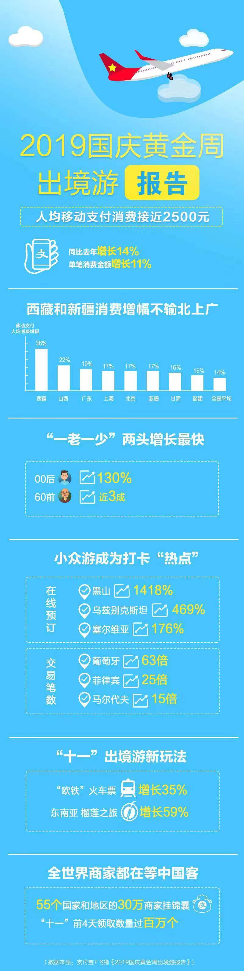 10月7日,支付宝联合飞猪发布的2019国庆黄金周出境游报告显示:“十一”期间,国人出境游移动支付消费再创新高,人均支付接近2500元,同比去年增长14%;单笔消费金额同比增幅达11%。
