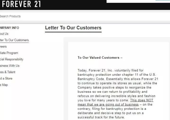 自己产品的竞争力不断下降,对手的规模飞速增长,内忧外患,张东文被逼到了绝境。7天前,Forever 21申请破产保护,并宣布关闭旗下300到350家门店。如张东文自己所说,“我创业时从未向银行借钱,说难听一点是无知,说好听一点是没有钱不做,有钱才做。”现在没钱了,那就先不做了。