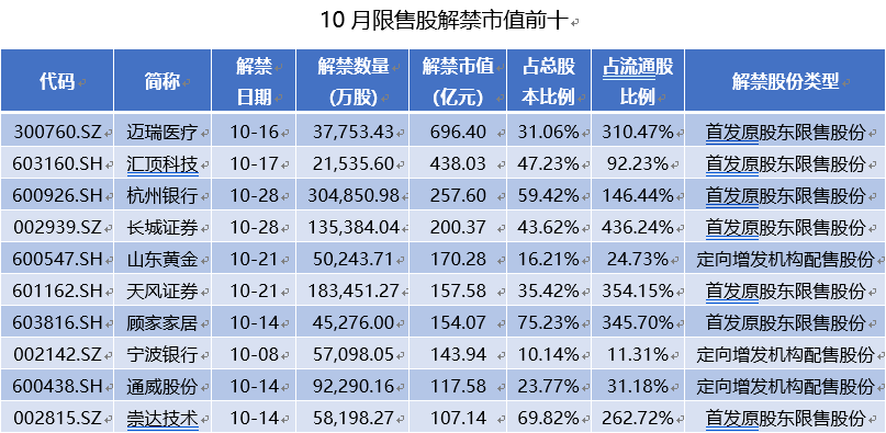 本月解禁市值超过100亿元的公司有10家,迈瑞医疗(300760.SZ)、汇顶科技(603160.SH)、杭州银行、长城证券五家公司解禁规模超过200亿元。这10家公司解禁后相关股东均有较高收益,其中多达8家为首发限售股份解禁。