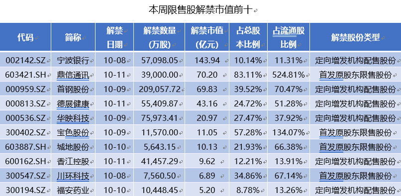 10月8日-11日共有23家公司合计53.05亿股限售股解禁上市,约合解禁市值402.12亿元。