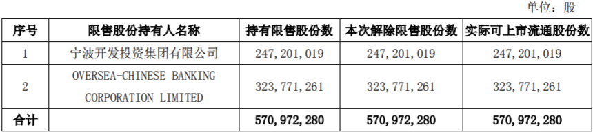 根据公告,宁波银行10月8日有5.71亿股定增限售股解禁,占公司总股本的10.14%。这是公司5年前向两位股东宁波开发投资集团有限公司和OVERSEA-CHINESE BANKING CORPORATION LIMITED(即新加坡华侨银行有限公司)定增发行的股份,当年募资总额30.93亿元。