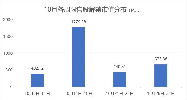 Wind数据显示,10月共有92家公司合计200.71亿股限售股解禁上市。以9月30日收盘价计算(下同),解禁市值3296.20亿元。