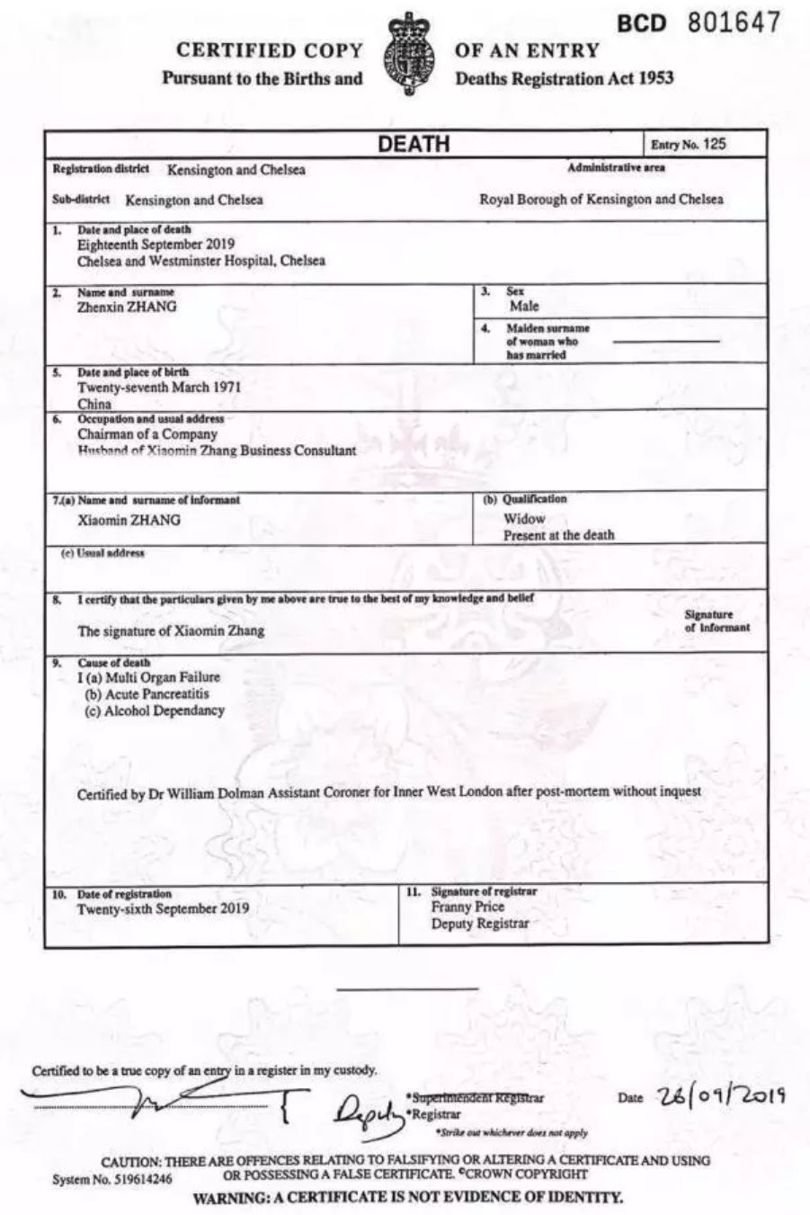 证明显示,出生于1971年3月27日的中国籍男子“Zhenxin ZHANG”于2019年9月18日在切尔西和威斯敏斯特医院死亡。死亡原因为多器官衰竭、急性胰腺炎与酒精依赖。