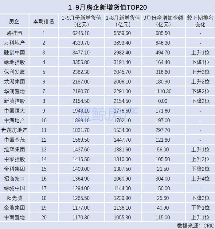 此外,行业内两极分化趋势进一步明显,龙头房企的货值优势仍然显著,销售TOP10房企新增货值占45%,较上月上涨3个百分点,TOP20房企的新增货值占比则达到63%。而截至9月末,年内已有24家房企新增货值突破1000亿元,其中,中骏集团、中国奥园(HK:03883)本月在本月迈入新增货值千亿阵营。
