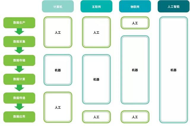 此外, 数据是人工智能底层逻辑中不可或缺的支撑要素, 没有数据针对人工智能的数据处理将无法进行。有了数据挖掘对数据的清晰、 集成、 归约等预处理手段, 人工智能才能拥有足够的数据进行学习。随着人工智能技术的迭代更新, 从数据生产、 采集、 储存、 计算、 传播到应用都将被机器所替代。
