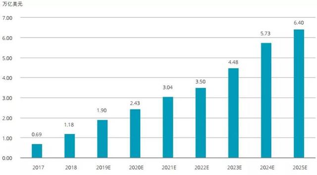 人工智能将提升社会劳动生产率, 特别是在有效降低劳动成本、 优化产品和服务、 创造新市场和就业等方面为人类的生产和生活带来革命性的转变。全球范围内越来越多的政府和企业组织逐渐认识到人工智能在经济和战略上的重要性, 并从国家战略和商业活动上涉足人工智能。全球人工智能市场将在未来几年经历现象级的增长。我们预测未来2025年世界人工智能市场将超过6万亿美元, 2017-2025年复合增长率达30%。