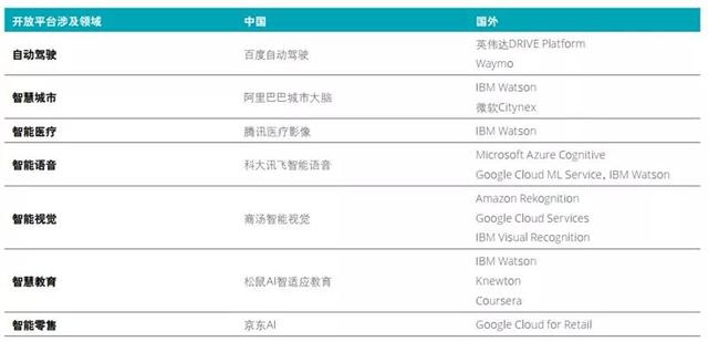 2017年, 科技部等部门经充分调研和论证, 确定了首批国家新一代人工智能开放创新平台:分别依托百度、 阿里云、腾讯、 科大讯飞公司, 建设自动驾驶、城市大脑、 医疗影像、 智能语音4家国家新一代人工智能开放创新平台。2018年9月, 科技部依托商汤建设智能视觉国家新一代人工智能开放创新平台。从目前的技术成熟度来看, 教育、 零售政务等多个领域已经拥有了以核心技术为驱动的应用开放平台: