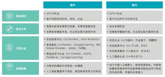 人工智能教育:国外的发展更为完善,中国虽然处于起步阶段, 但发展前景更为广阔。 人工智能技术在教育行业的应用在国外的发展更早, 早在二十世纪九十年代已经出现了智适应技术。人工智能教育产品在欧美国家的渗透程度更深, 通过近十年的发展, 覆盖了各年龄段的用户,涵盖了早教、 小学、 初中、 高中以及职业教育中的多个学科, 应用的场景也相对更为广泛, 以To B为主, 包括考试机构、 学校、 企业。代表企业主要可以分为三类, 包括向智适应教育转型的在线教育平台, 例如Coursera, KhanAcademy;教育集团智适应事业部,例如培生提供以GMAT为代表的计算机智适应测评考试;此外还包括试图囊括学习五大环节的智适应教学平台,已经出现了Knewton、 Aleks等明星公司。