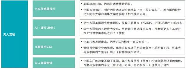 无人驾驶:美国凭借深厚的技术沉淀领先中国 。无人驾驶涉及到的技术包括汽车传感器技术、 AI软硬件、 V2X以及无人驾驶测试四个方面。在传感器技术以及AI软硬件方面, 美国借助政府力量以及长久以来的技术沉淀拉开了与中国的技术差距。但是中国也依靠科技巨头与科研院校在上述两个方面加速追赶。