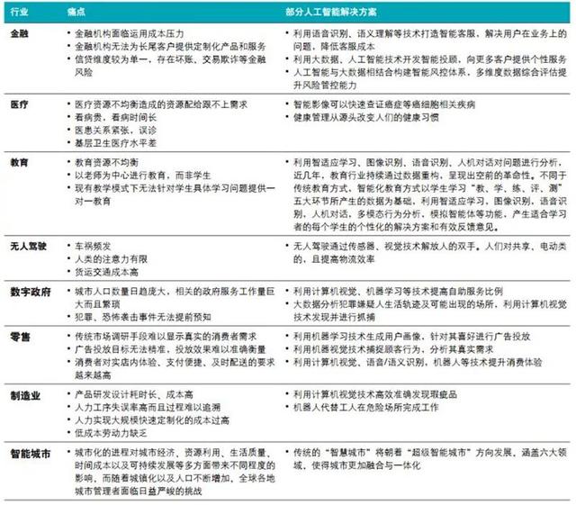 各行业面临的痛点有所不同, 例如金融行业面临成本压力、 产品服务单一、 交易欺诈等, 医疗与教育行业均面临资源分配不均等。虽然问题不同, 但通过数据收集、 处理与分析能够有效解决上述多样的问题, 而人工智能通过数据驱动能够改变产业。