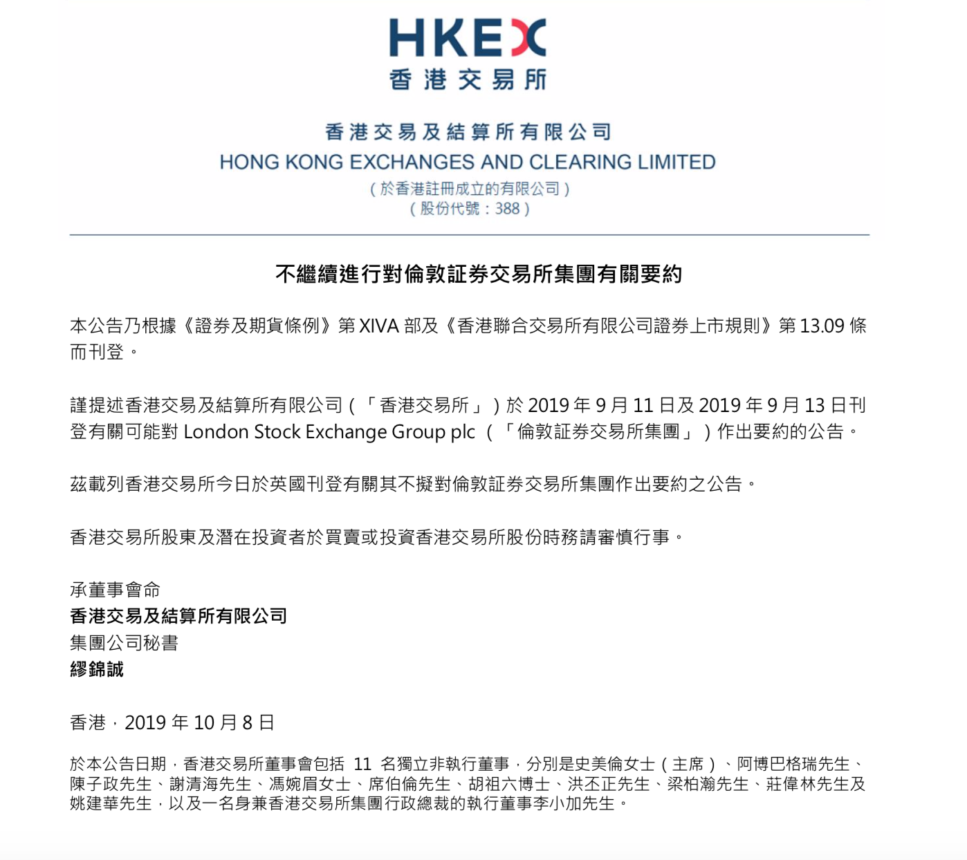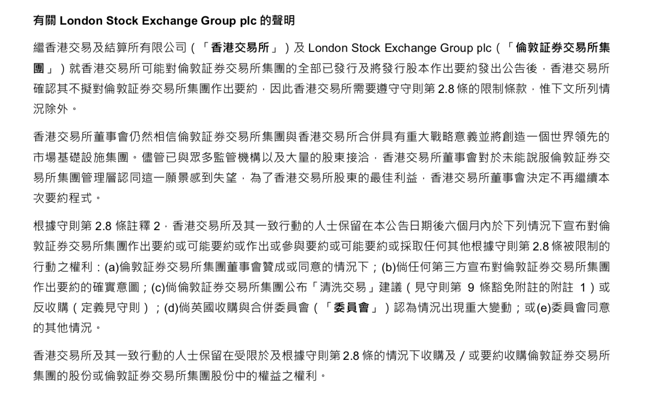 港交所表示,董事会仍然相信伦交所集团与港交所合并具有重大战略意义并将创造一个世界领先的市场基础设施集团。港交所董事会已与众多监管机构及大量股东接洽,对于未能说服伦交所集团管理层认同这一愿景感到失望,为了港交所股东最佳利益,董事会决定不再继续本次要约收购。