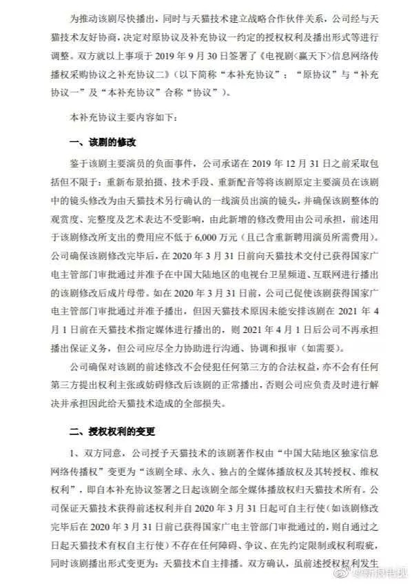 10月8日,唐德影视发布公告,称与天猫技术于2019年9月30日签署了《电视剧<赢天下>信息网络传播权采购协议之补充协议二》,约定于12月31日之前用包括重新布景拍摄、技术手段、重新配音等手段将《赢天下》“原定主要演员在该剧中的镜头修改为由天猫技术另行确认的一线演员出演的镜头,并确保该剧整体的观赏度、完整度及艺术表达不受影响,由此新增的修改费用由公司承担,前述用于该剧修改所支出的费用应不低于6000万元(且已含重新聘用演员所需费用)。”