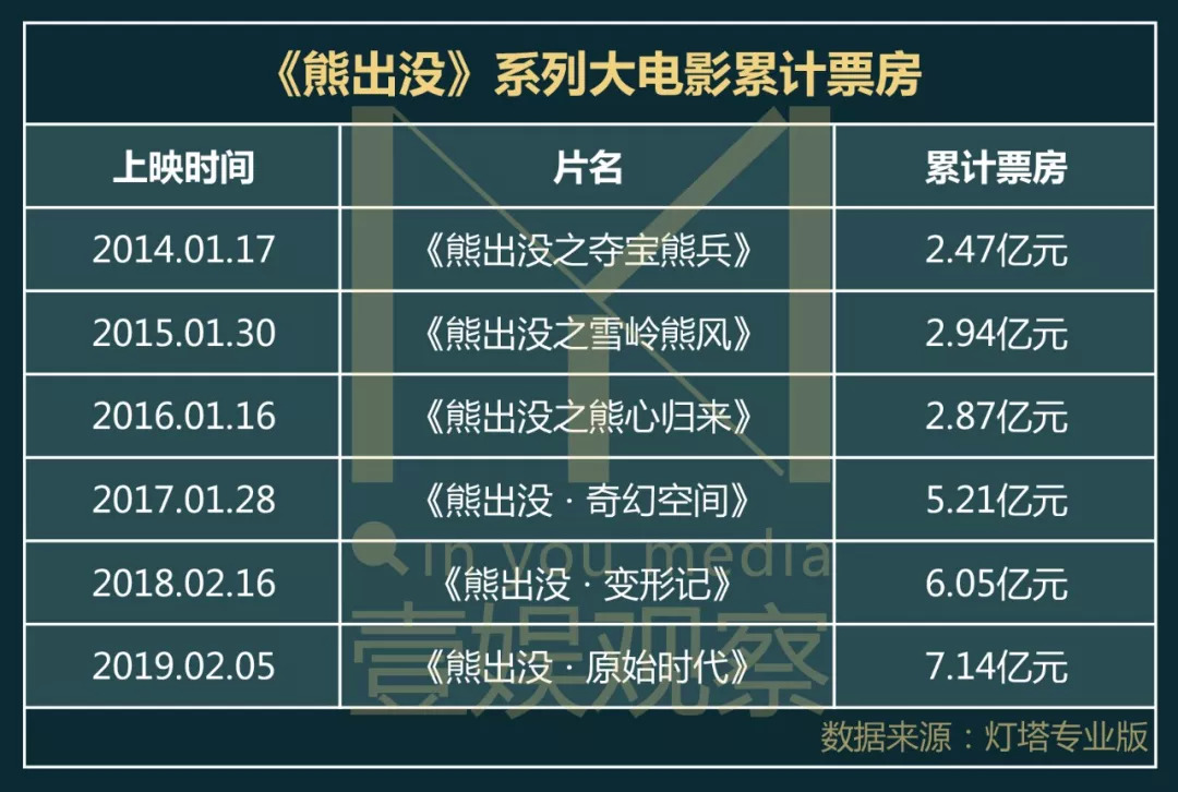 2012年原创动画《熊出没》登上央视少儿频道,至2019年又有十部动画片、两部贺岁片在央视播出;同时,自2014年开始至2019年,共有六部《熊出没》大电影登上大荧幕,至今累计票房超过26亿,可以说是最具影响力的动画IP。