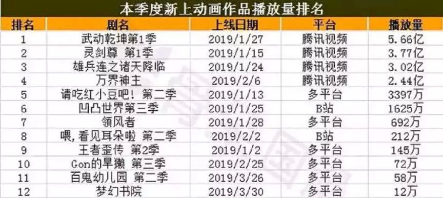 根据骨朵数据显示,2019第一季度新上动画作品播放量第一名为《武动乾坤》的5.66亿,《灵剑尊》《雄兵连之诸天降临》位列二、三位。大多数的作品还不能获得更多受众的关注,爆款或高热度作品仍是个例,破圈仍有困难。