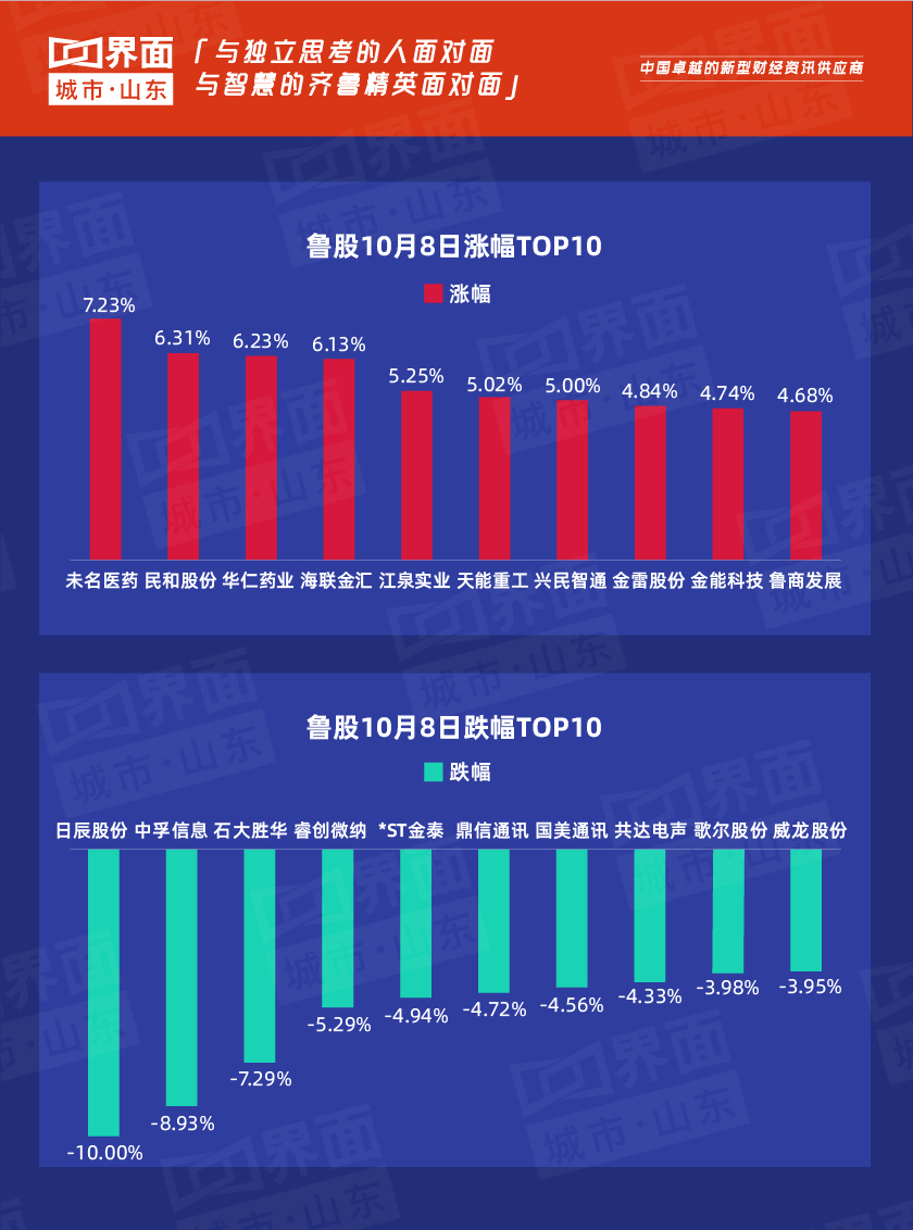 10月8日,山东省内沪深股票有109只个股上涨,83只下跌,14只与上一个交易日收盘价持平;