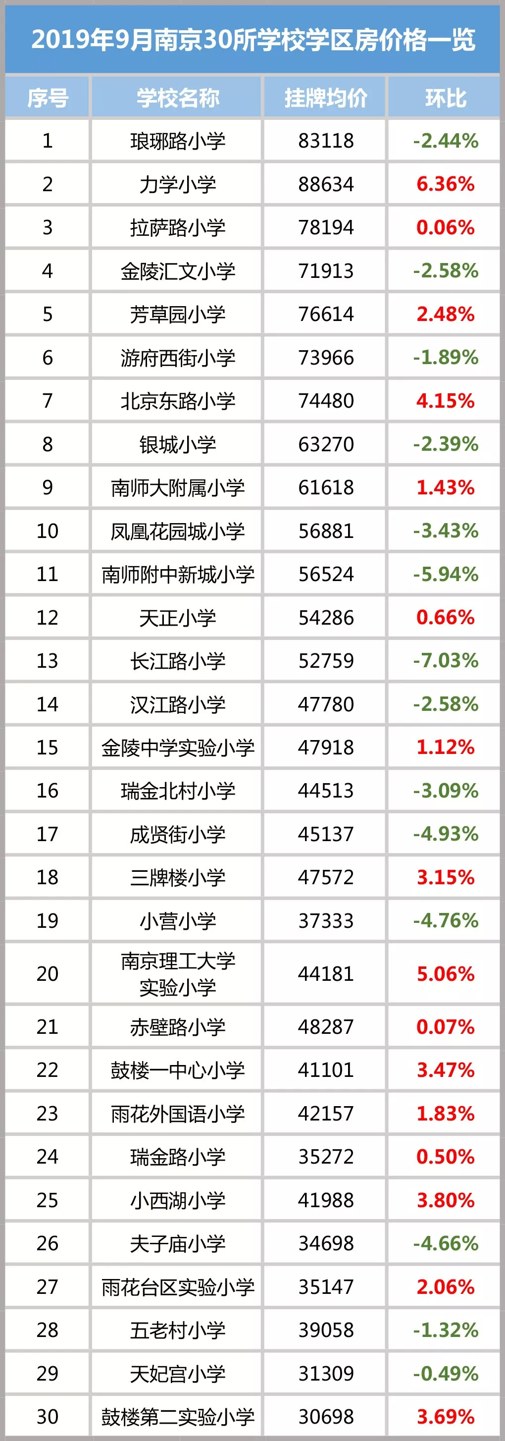 据相关数据显示9月南京30所名校学区房价格已新鲜出炉,其中有16所名校学区房价格出现上涨。涨幅最大的为力学小学,学区房挂牌均价环比上涨6.36%,其次是南京理工大学实验小学和北京东路小学,分别上涨5.06%、4.15%。