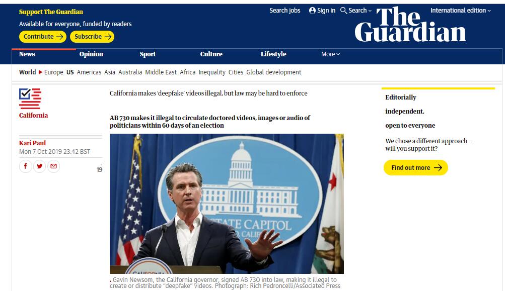 【美国】加州立法禁“深度伪造”视频