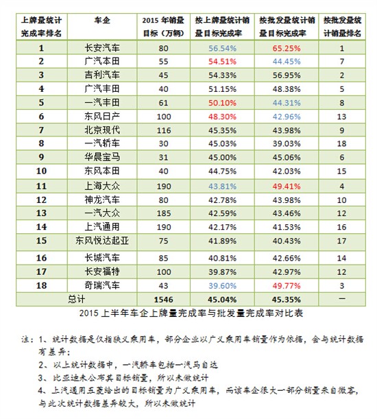 对比2015年制定的销量目标,各车企上牌量完成率总体优于批发量完成率。首先,在总数方面,上牌量完成率超过45%(按照以往经验,上下半年的销量占比一般为45:55,即上半年完成全年销量目标45%才算合格)的车企达到9家,占到统计数据的一半。其次,虽然多数车企在两项数据表现上的差距在可接受范围内,但仍有6家车企的上牌量数据和批发量数据出入较大,其中3家上牌量明显高于批发量;而另外3家车企的批发量比上牌量多出很多。