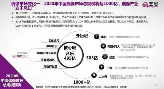 尽管如今大多数限定团都糊了,但经过了两年偶像综艺的轮番上阵,确实为我们的偶像市场撕开了口子,据2018年艺恩发布的《偶像产业迭代报告》显示,2020年中国偶像市场总规模将超1000亿,而这个数字也正在吸引更多的公司和资本走进偶像行业,完善产业链条上的各个环节。